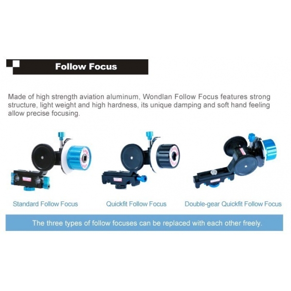 You can mark the focal spots by a marker on Wondlan Standard Follow Focus in advance, to achieve easy switches of focal spots and so on. The Standard Follow Focus has two accessory follow focus rings, which support DSLR lenses and film camera lenses of all apertures.